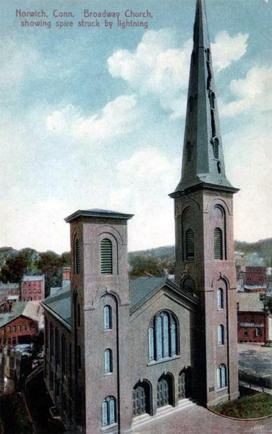 The Broadway Congregational Church, a much larger building than the first, was built in the Romanesque Revival style between 1855 and 1857. The building originally had a spire that was 200 feet high, but it was struck by lightning and removed in 1898. The church stands at 87 Broad Street today.