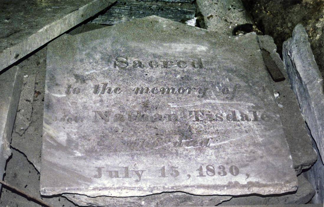 The upper portion of Dr. Tisdale’s headstone, shown on the left, was photographed in the church’s basement by Jos. N.R. Morneault in 2006.