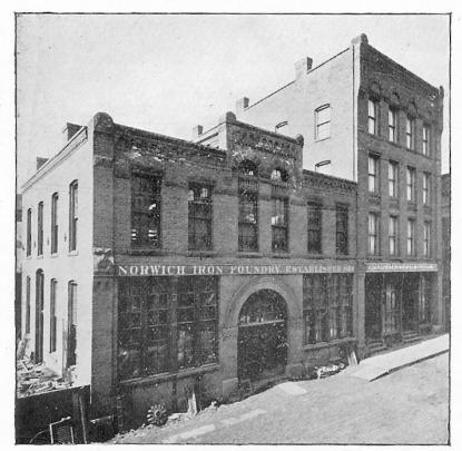Alfred H. Vaughn founded the Norwich Iron Foundry in 1854. Both light and heavy iron goods were made and sold by the enterprising proprietors of this extensive industry. This establishment fronted on Ferry Street 135 feet, and extended through to Rose Place, a distance of 175 feet. In 1884, the foundry was materially enlarged to a four-story brick structure with a frontage of 35 feet on Ferry Street, now primarily occupied for the storage of patterns.