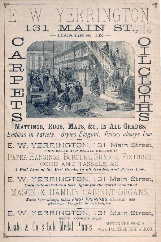 Ezra Yerrington, born in Norwich in August 1828, operated a large wholesale and retail business, which he founded in 1862, located at 131 Main Street in downtown Norwich, and which specialized in a wide variety of home furnishings and decorations that were in high demand to furnish a Victorian home during the boom times of the mid-1800s. The first floor of his store was devoted to the sale of wallpapers, curtains, borders, oil cloths, and other wall coverings, along with an assortment of traditional Victorian novelties. The second floor was utilized for the sale of pianos and organs; a selection of at least twenty-five was on display at any time. On the third floor, you would find a large selection of carpets, mats, and other floor coverings.