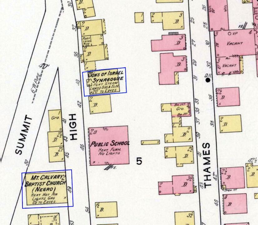 NOTE: The 1914 map shown on the left shows the location of both the Sons of Israel Synagogue and the Mount Calvary Baptist Church.