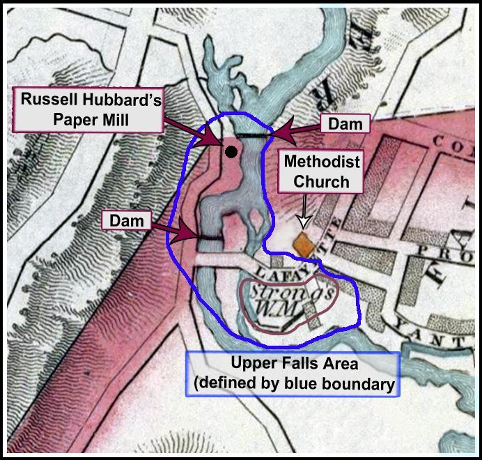 William Lester Jr.’s 1833 Map of Norwich, shown on the left, pinpoints the exact location of the Methodist Church located very near Yantic Falls on Lafayette Street. This building was home to the “Falls Society” from 1825 to 1834. In 1855, the Sachem Street Methodist Episcopal Church became home to the Falls Society.